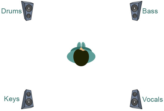 To avoid having the loudspeaker directionality of the experiment be altered or diminished by room reverberation, the experiment was carried out in an anechoic room on the campus of Aalborg University, Copenhagen. Four Dynaudio BM5 MKIII loudspeakers were used in the configuration, which also included a Steinberg UR44C audio interface connecting the laptop to the speakers. Only one instrument per channel was used as a signal for each loudspeaker. Drums, bass, vocals, alternating piano or guitar, and multitrack recordings were reproduced using the Digital Audio Workstation Reaper to route the instruments to separate speakers. For all three sessions with the participants, no routing changes were applied to maintain consistency between the experiences. The amplitude level of each channel was set by the authors to obtain a balanced mix that allowed a normal-hearing person to perceive all the instruments with equal loudness in the center of the room. The single recordings were played without any effect, such as reverberation or compression, to avoid any possible confusion for the listener.