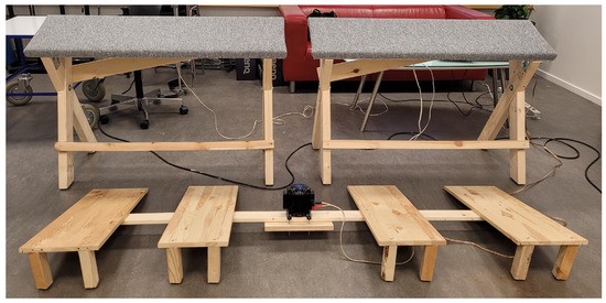 Two benches measuring 120 × 30 × 75 cm and four footrests of 38 × 73 × 18 cm were built, using common woodworking materials: beams of 38 × 76 cm for the bench legs, the beam connecting the footrests, and beams of 38 × 38 cm or 14 × 76 cm for structural reinforcements. The top of the benches were cut out of 17 mm high-density fiber board and were covered with a thin carpet-like material in order to avoid slipping. The footrests were cut out of 15 mm-thick pine wood, and each one was engraved with Figure 3 in order to encourage exploration of different postures. Figure 4 shows the leaning benches and footrests as they were used at the concert. All contact points with the ground had rubber feet of 2 × 2 × 2 cm in order to decouple the system from the floor and to avoid slipping—a behavior noticed especially in the case of the footrests. Each of the benches was actuated by a ButtKicker Mini Concert bolted in the middle, underneath the sitting area, while the footrests had a single ButtKicker LFE attached; this meant that the outer ones produced slightly less vibrotactile stimulation.