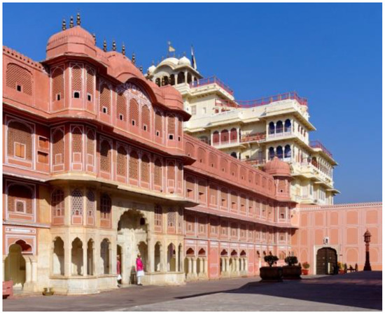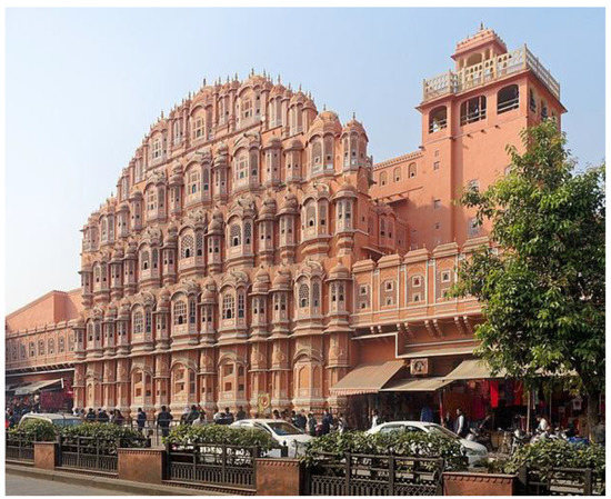 This part is dedicated to so-called “pink cities”, which owe their nicknames to the dominance of pinkish tones in their urban spaces. Although Jaipur is located in India, it is so widely known as “Pink City” because of the predominance of pink-colored buildings in its oldest district that it cannot be excluded from this section. Jaipur, one of India’s earliest planned cities, was founded in 1727 by Maharaja Sawai Jai Singh. According to popular myth, the old town buildings started to be painted in coral-pink color in 1876, during the rule of Sawai Ram Singh I, to honor Queen Victoria’s son, Albert Edward, Prince of Wales (who later became King Edward VII, Emperor of India) during his visit (Stone City Blog 2021). However, the buildings in Jaipur were painted in this color, representing welcome and hospitality in India, much earlier. The pale salmon pink paint was used on buildings to imitate the aesthetics of façades made of the much more expensive and less available pink sandstone, from which cities such as Delhi and Agra were built (Blegvad 2019). Many buildings and palaces remain painted in “Jaipur Pink”, as it is known today, primarily due to urban regulations. Although the exact pink color is not specified by law, different pink nuances give Jaipur its distinctive appearance to this day. Among the most beautiful of Jaipur’s pink palaces are, undoubtedly, Chandra Mahal, or City Palace, built in 1727 and the former seat of the Maharaja of Jaipur (Figure 2), as well as Hawa Mahal, also known as the “Palace of Breeze”, built in 1799 as an extension to the Royal City Palace of Jaipur for the women of the royal household (Blegvad 2019) (Figure 3).