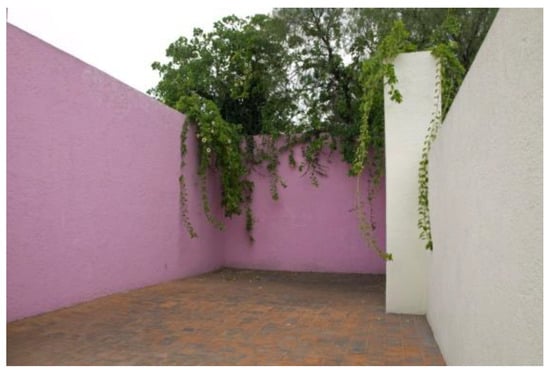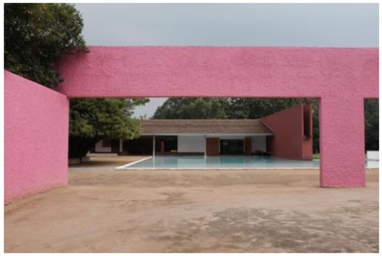 The tradition of “Mexican pink” is also livable and cultivated in the architecture of that country. Especially, two 20th-century Mexican architects who widely used pink colors in their works should be mentioned here: Luis Barragán (1902–1988), winner of the Pritzker Price in 1980 and regarded as the most influential person in modern Mexican architecture, and Ricardo Legorreta (1931–2011), awarded the prestigious UIA Gold Medal in 1999, the AIA Gold Medal in 2000, and the Praemium Imperiale in 2011. Barragán, in frequent collaboration with the artist Jesús “Chucho” Reyes, often used pink in the houses he designed, especially in Mexico City. One of the nuances is even named “Barragan pink.” Barragán House, the personal residence built by Barragán in 1948, where he lived and worked until his death, and which has a characteristic pink wall surrounding the roof terrace, was a manifesto of his architectural approach (Barragán House 2023) (Figure 6). House Pedregal (Casa Pedregal), designed in 1947–50, has an entirely light pink exterior and a pink kitchen and hallways. Also, House Gilardi (Casa Gilardi), created in 1975–76, is one of the architect’s undisputed masterpieces and features a bold color palette consisting of bright pink for the front and rear façades (Gilardi House 2023). However, Barragan’s most famous project featuring pink is Cuadra San Cristóbal, in Los Clubes, built between 1967 and 1968 in collaboration with Andrés Casillas for Folke Egerström and his family. One of the most recognizable elements of the complex is the massive, horizontal wall finished in pink stucco, which defines the north–south axis of the plot, dividing it into two parts—one more private, and the second mainly dedicated to equestrian facilities (Cuadra San Cristóbal 2023) (Figure 7).