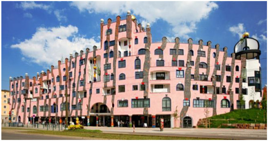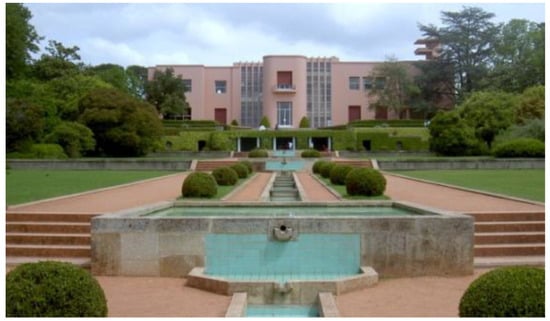 Casa de Serralves, known locally as “Casa Cor de Rosa” or “Pink House”, is a villa and museum located inside the Park of Serralves in Porto, Portugal. It was commissioned by the second Count of Vizela, Carlos Alberto Cabral, and built by the architect José Marques da Silva between 1925 and 1944 (Blegvad 2019). The pink color, chosen for façades as well as for the garden surfaces and the edging walls of the water channels, was dreamed up by the French architect Charles Siclis, whom Cabral also consulted. He sent the Count two watercolors depicting the façades of the villa with all the elements of the design tinted pink. That became the starting point for the final color palette of this outstanding example of French Art Deco architecture (Leevers 2020). Today, Casa de Serralves serves as the headquarters of the Serralves Foundation (Fundação de Serralves) and is an important extension of the Museum of Contemporary Art, used mainly for temporary exhibitions (Figure 10).