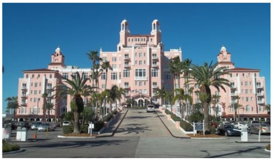 During the interwar period, pink color became very popular in the architecture of the United States. At that time, many buildings in Art Deco style were finished in coral or pink pastel stucco, partially inspired by the peachy-pink colors typical of the traditional architecture of Havana and other Cuban places (Massello 2017). Among the famous pink-colored buildings from the 1920s is the hotel The Don CeSar Beach Resort and Spa, also known as the “Pink Lady”, designed by Henry H. Dupont in 1928 and located in St. Pete Beach, FL, USA (Massello 2017) (Figure 11).