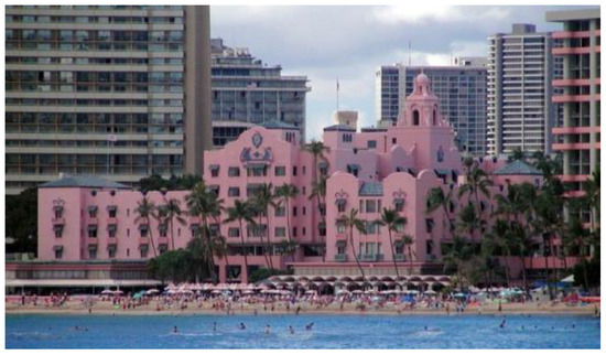 Another outstanding pink hotel is undoubtedly The Royal Hawaiian Hotel, on Waikiki Beach in Honolulu, on the island of Oahu, Hawaii. It was designed in a Spanish Revival and Moorish-inspired style by the renowned architectural firm Warren and Wetmore in 1927. The nickname “Pink Palace of the Pacific” was given thanks to the hotel’s prominent location and the pale pink color of the stucco façades. The color was chosen presumably by a landscape architect to match the exotic setting and contrast with the sea’s blue and the surrounding greenery (Massello 2017) (Figure 12).