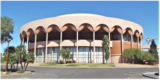 Although the famous architect Frank Lloyd Wright (1867–1959) did not use pink very often, his use of that color was as ahead of his time as his architectural works. According to some sources (Massello 2017; Cills 2017), pink was among the colors proposed by Wright for The Guggenheim Museum (New York, NY, USA). Although that building, finished shortly after the architect’s death in 1959, is white-colored today, Wright’s watercolor paintings show different color variations, including the pink one. Two pink colors, Wright Shell Pink and Wright Flesh Pink, were also included in the “Taliesin West color palette”, a set of 36 colors inspired by the natural landscapes of Arizona, developed by Wright for Martin Senour, a West Coast paint brand, in 1955 (Massello 2017; Cills 2017). Wright actually completed two pink-colored buildings. Pinkish, earthy tones distinguish the Grady Gammage Memorial Auditorium in Tempe, AZ, USA (1964) (Figure 15), and pale pink is the distinctive color of the stucco walls of the Marin County Civic Center (“Big Pink”) in San Rafael, CA, USA (1957) (Frank Lloyd Wright Foundation 2023). It is also worth mentioning the light pink volumes of The King Kamehameha Golf Course Clubhouse in Waikapu, Maui, HI, USA (1993), designed by John Rattenbury but based on Wright’s 1957 project of an unbuilt house for Marilyn Monroe and her husband Arthur Miller (Massello 2017).
