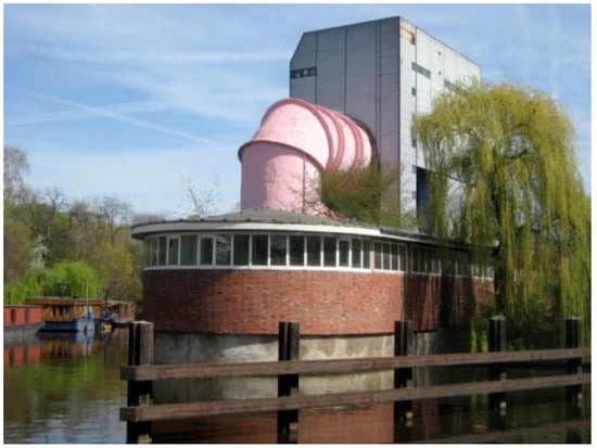 But an exterior pink color was chosen not only for the façade finishes of luxury hotels and extravagant villas. One of the examples of the unique uses of this color in industrial architecture is the circulation tank Umlauftank 2—UT2, also known as Rosa Röhre (Pink Tube), located in Berlin, Germany. The flow circulation channel of the Laboratory for Hydraulic Engineering and Shipbuilding (Versuchsanstalt für Wasserbau und Schiffbau) at the Technical University of Berlin was constructed between 1968 and 1974 and designed by the architect Ludwig Leo and the engineer Christian de Boes. The box-shaped laboratory was clad in aluminum panels in blue, while the giant tube was coated with a thick layer of PU foam and painted pastel pink. Stylistically, the building, listed since 1995, belongs to post-war modernism and the international avant-garde, being called an icon of pop art architecture. From 2014 to 2017, the architect HG Merz renovated it on behalf of the Wüstenrot Foundation, and the already faded colors were carefully restored (Umlauftank 2023; Rosa Röhre 2023) (Figure 16).