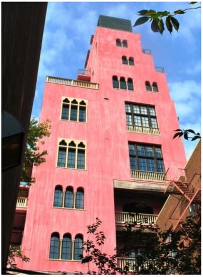 A list of iconic buildings colored in pink must include The Pink Palace Mansion (Los Angeles, CA, USA), purchased in 1957 by the famous actress Jane Mansfield and her husband, Mickey Hargitay. The Mediterranean-style mansion was fully painted pink, which became synonymous with the actress. It was, according to her, a “pink landmark”. The Pink Palace was sold after her premature death in a car accident in 1967 (Blegvad 2019). Although the house was demolished in 2002, its aesthetics are still an inspiration for many contemporary buildings, for whose owners, as for Mansfield, pink is more than just a color, becoming an expression of their lifestyle and a feature distinguishing them from the environment and society (e.g., the houses of Jamie Nelson and the House of Adora presented in Section 3.4).