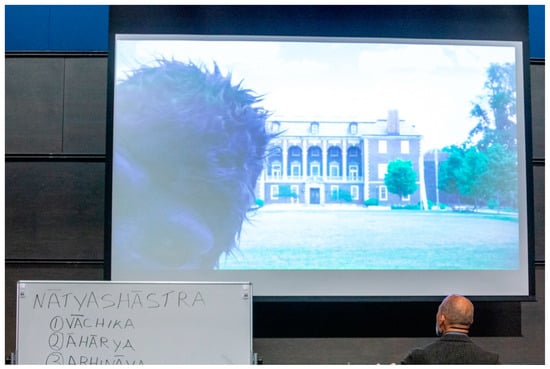 Indian dance makes an appearance in To the Academy through the theatrical character of a Bharatanatyam dancer, who engages in sporadic postures, mudras, and steps woven into dialogue, rather than gives a dance performance per se. At the top of this scene, a man at a podium organizes notes and writes talking points about the Natyashastra on a white board. To his right a woman in a Bharatanatyam costume sits waiting (Figure 3).