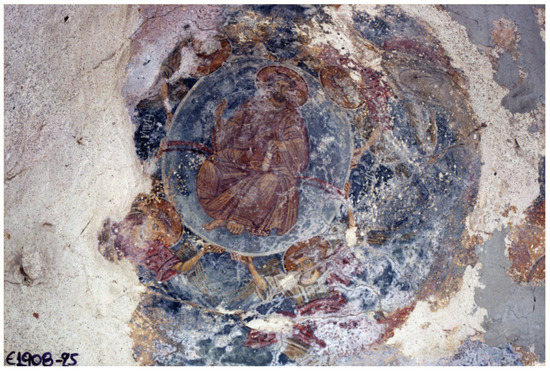 Structurally, the building conforms to the practicalities of the island; the abundance of dolomitic stone dictated the rubble masonry with which it has been built. Whether or not, prior to its consecration to a church, it was an Islamic mesjit it is an interesting premise that accords with the eccentrically built conch and the similar findings from Crete. Architecturally, the conical domes have been present in the wider Aegean area since the 7th century, e.g., the building attached to the south in the Drossiani complex, or the Vangelistra church of the 8th/9th c. at ancient Minoa in Amorgos until the late 14th century in Chios (Drandakis 1988, pp. 20–22; Marangou 2002, pp. 316–19, pl. 220a; Vassi 2012, pp. 67–68, 160–62, 165, 258–70). That their presence owes its reception and appropriation from cultural exchanges with the Arabs would look highly probable, but it is worth noting that the corbelling technique itself was part of a vernacular building tradition practiced in the Aegean, as the insular cases of Saria (Deligiannakis and Karabatsos 2017) and Halki (Sigala 2018, pp. 356–57) attest to. The restoration of the building in the 1960s might have taken away important information from the masonry of the church that could corroborate an early dating for the edifice, but that does not negate the fact that the painting consisted of part of a program to update the building and render it appropriate for Orthodox worship (Sigala 2018, p. 356, with the literature).