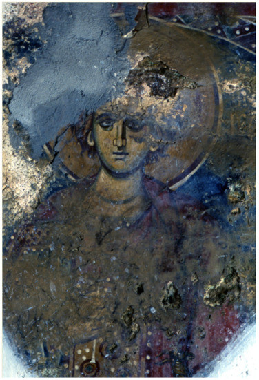 The image of the patron Saint Mamas19 is framed by a painted proskynetarion20 (Figure 11). The young saint is depicted with tousled hair and a red mantle, holding the martyr’s cross in his right hand. To the right of his head, part of the inscription is preserved: MA/MA. The lower parts of the image are whitewashed.