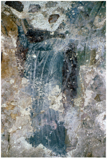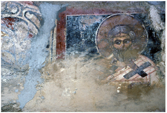 On the west wall, a female saint is partly preserved (Figure 7). She wears a light green maphorion and holds a white glass bottle. No eponym has survived. The iconography, with the simple, green maphorion and bottle, recalls Saint Anastasia Pharmakolytria in the narthex of the church of Panagia Asinou in Cyprus, dating from the late 13th century (Kalopissi-Verti 2008, pp. 115–22). The depiction of Saint Anastasia is suited to the healing character of the church as well as its funerary context.