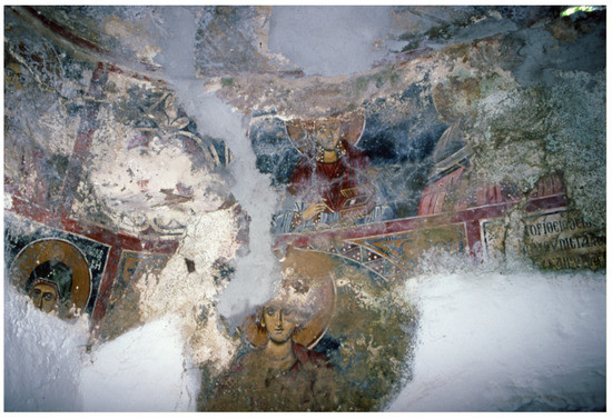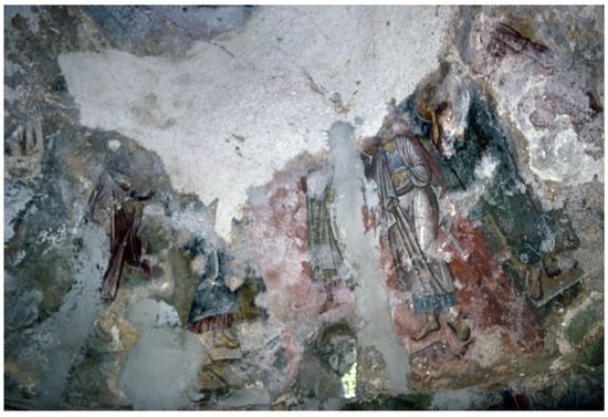 On the lower zone of the west wall, north side, is Saint Paraskevi H A/ΓΊ/Ạ ΠAΡACΚΕ/B, in her usual representation with a dark blue maphorion16 (Figure 10). Only part of her head is visible under the layers of plaster. The association of Saint Paraskevi with the homonymous day of Holy Week (Friday), i.e., the day of the Passion, was one of the reasons that she was often represented in the murals of churches, particularly those of funerary function (Gerstel 2015, p. 66). She is also closely associated with the cult of the Holy Cross (Mouriki 1993, pp. 253–54; Kaffenberger et al. 2021, pp. 347–48). For this reason, she is usually depicted close to Saint Kyriake17. Above her, Theodore Stratelates can be seen. She was also known as an intercessor to God on behalf of shepherds and farmers (Konstantellou 2019, p. 255, with the literature). The saint was very popular in Byzantium and the south of Italy (Andronikou 2017, pp. 11–13).