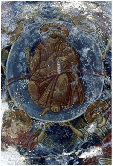 The apse is occupied by the monumental figure of Christ Pantocrator (Figure 5). The scroll in his hand reads Ζῶν ἄρτος ὁ/(ἐκ τοῦ οὐρανοῦ κα)ταβ(ὰς)10 (The Living Bread that descended from Heaven). This Eucharistic inscription is known from the Hermeneia of Fournas (Papadopoulos Kerameus 1909, pp. 228, 279), but this version, with the biblical verse slightly changed, appears unique in monumental art11. It is attested only on the panagiarion of Andreas Ritzos at Patmos (Chatzidakis 1977, pp. 64–65, pl. 88) and, later, in post-Byzantine times, the Christ in the Melismos is occasionally inscribed «Ζωηφόρος άρτος».12 On either side of his head, the sigla (XC) are inscribed in large red medallions. Such abbreviations within usually red roundels appeared in the 12th century but continued until the Late Byzantine period (Papamastorakis 2001, p. 66), such as, for example, in the second layer of the painted decoration of the church of the Virgin at Archatos (1285) on Naxos (Konstantellou 2019, p. 207, fig. 264) and several other examples from Crete, until as far as the beginning of the 16th century13. The lower zone consists of saints’ busts.