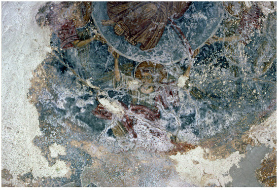 Two healing saints are depicted next to each other. The first is young, with curly hair, holding a casket on his left and a spoon that looks like a lance to his right21 (Figure 12). On the right is part of his hagionym, (ΠA)ṆTE(ΕHΜΩΝ). Saint Panteleemon, a doctor from Nicomedia22, was highly venerated in the eastern parts of the Byzantine Empire, particularly in Rhodes and the nearby islands23. Next to him, another saint with a pink chiton and a light blue cloak also holds a spoon and casket, but is heavily damaged and cannot be identified. He might be one of the two most important Anargyroi, Saint Kosmas or Damian (Kyriakos 2018), or Saint Hermolaus.