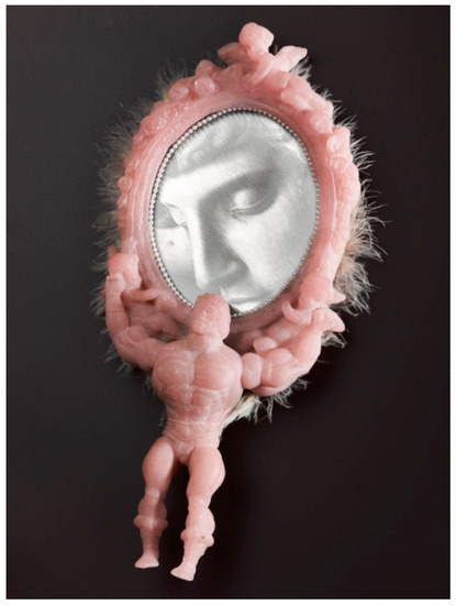 Hand mirror, pink cast glass; the handle is the figure of the TV cartoon character He-Man supporting a frame with cherubs, with the image of Adonis in the mirror surrounded by imitation pearls by Liz Crowley, London, England, c. 1985. Image © National Museums Scotland.