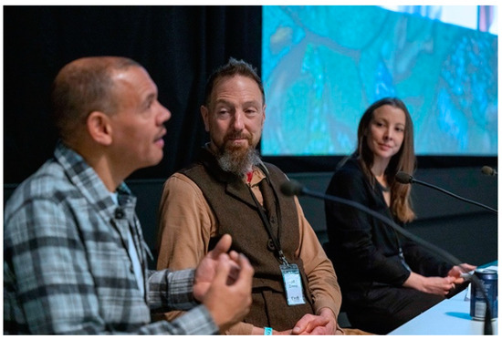 Right to left: Christopher Day, Jeff Zimmer and Sarah Rothwell in discussion at the Craft Scotland Conference, 2022. Photography by Neil Hanna for Craft Scotland.