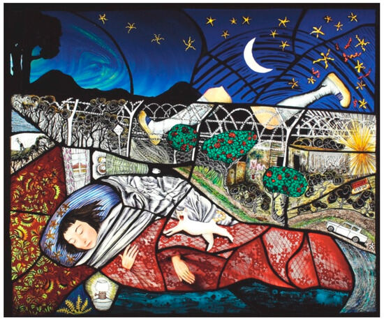 First to speak was the Scottish-based multidisciplinary artist Pinkie Maclure, who creates humorous, dark works of glass art that are a social commentary on the Anthropocene, upending the impact of man on the natural world. She believes that our present is haunted by our past and we have more in common with our ancestors than we may know. Using stained glass installations, she makes intimate work that examines today’s big issues, such as addiction, insomnia, and our relationship with nature. Maclure uses the distinctively chaotic nature of stained glass to express deep anxieties—often with dark humour—exploiting the tension between the sacred and the unexpected, speculating at a time when the end of the world feels closer than ever. During the conference, she was able to share a range of artworks to narrate her artistic approach that explore the themes of the session, including her poignant work Self-Portrait Dreaming of Portavadie (2019) (see Figure 7). This artwork explores the artist’s memories, connection with place, and sense of loss around her childhood holiday cottage at Portavadie on the west coast of Scotland, following the destruction of the Loch after the government sold the surrounding land to a company who dynamited the shallow bay to build oil platforms, killing the delicate ecosystem within.20 The piece layers surrealism and historic symbolism in a poetic manner, sensitively combining imagery of her family within the landscape in happier times with the brutality of the concrete building, razor-wired and with symbols of occupation of the land. Maclure does not shy away from themes of this nature, challenging us, the viewer, to take responsibility for our impact upon the landscape, and the sector to be open to creating works that discuss such topics, whilst commemorating a forgotten area of outstanding natural beauty whose destruction has been covered up by the passage of time. This is a very personal work for the artist and explores a narrative that will resonate with many who have experienced or been frustrated and dismayed by the actions of heavy industry upon the landscape. It is not a shortbread view of Scotland; it is raw and true to her memory of the situation.