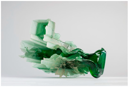 As discussed above, the issue society currently faces in terms of recycling glass is that the current infrastructure has limitations on what glass can and cannot be recycled. Looking to overturn these presumptions on what waste glass can be recycled is part of Danish artist, researcher, and educator Dr Maria Sparre-Petersen’s practice, which investigates issues of sustainability and ethics through material exploration, creating glass sculptures from a range of recycled glass materials, including glass containers, that focus on glass’ plasticity and uncertainty as an infinitely recyclable material. In recent years, her work has taken the formats of installations, sculptural objects, and interactive collaborations in public spaces, often incorporating extensive experimentation with robotics and 3D printing as well as concepts of failure and imperfection. In her discussion for The Power of Glass Conference, Sparre-Petersen openly shared her creative practice and sustainable approach to materiality and making, whilst also raising key questions about how we need to teach sustainability within our educational models considering the climate emergency. Her discussion highlighted how her work explores, and is part of, a closed-loop cycle and the need to eliminate waste and pollution, circulate products and materials, and regenerate nature.22 There are, however, greater challenges with working with recycled materials, as the material needs to be handled differently because the chemical structure may be incompatible because the waste glass is likely to have been made from different recipes, thus it will not expand in the same way or as expected, creating internal stresses in the material that may develop cracks immediately or over time. There is potential in waste glass for those such as Sparre-Petersen, who see these challenges as part of a process of investigation, finding satisfaction in the uncertainty of the outcome, making the potential visible rather than achieving a preconceived work of art which her series Epistemic Artefacts (see Figure 9) reflects. Thus, through her research into recycling waste glass, Sparre-Petersen is helping the sector to form the view that material sustainability is a necessary consideration, and in fact a given part of all current and future contemporary Art Glass practice.