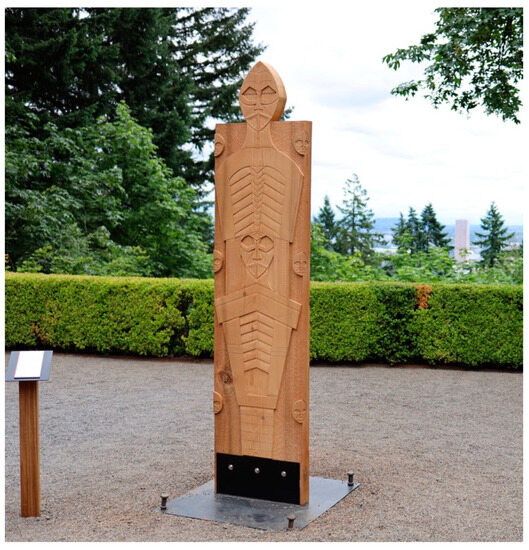 But the Cathlapotle Plankhouse has been helpful with that recognition. One of the reasons I took that at times nightmarish job there, was knowing that it would become a field trip destination. So at least new generations of kids would know and could say “Oh, look, this is Chinookan art and these are the type of houses people lived in here.” So, you see public art—with Chinookan form—has quadrupled in less than ten years. Maybe even more than that, maybe ten times. Because I don’t think, I don’t even know if there were any public Chinookan art pieces in Portland before that, were there? There were maybe some vague references here and there. I’m sure there must have been something, but I just can’t think of any.