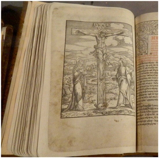 The Crucifixion, from a Minaion (August), 1558, print from an engraving. Church of the Panagia Katholiki, Pelendri. Photo: Author, by permission of the Cyprus Department of Antiquities and the Holy Bishopric of Limassol.