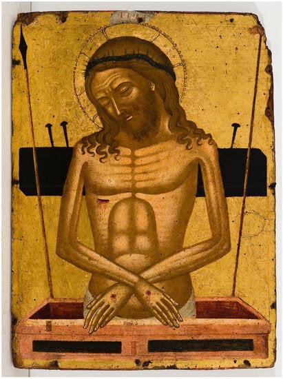 - Van Os, Henk. 1978. The Discovery of an Early Man of Sorrows on a Dominican Triptych. Journal of the Warburg and Courtauld Institutes 41: 65–75. [Google Scholar] [CrossRef]