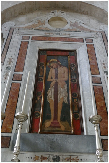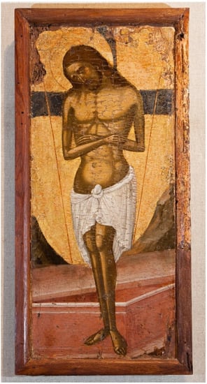 In Venice, these images were meant for private worship or meditation during the Eucharist (Goffen 1989, pp. 68, 78). A Man of Sorrows in bust would often occupy the vertical, central axis of an altarpiece, specifically, as an upper part of a polyptych (see for example Figure 30); such representations pointed up the Eucharist’s miraculous transubstantiation of the bread and wine into the true body and blood of Christ on the altar that hosted an altarpiece (Humfrey 1993b, p. 74; 1993a, p. 628). The full-length Man of Sorrows was hardly known in Italy before the fifteenth century. However, there existed a type that presented a whole-bodied Christ, who dripped his blood into a chalice, giving the name to an iconographic variation of the Man of Sorrows known as “Blood of the Redeemer” (Sangue del Redentore)—even though a chalice does not appear in all surviving examples (Figure 4) (Dalvit 2017, pp. 29–59, at 39–44). The full-length, standing Christ in the Blood of the Redeemer was more often linked with actual liturgical objects, such as doors for tabernacles, where the Holy Communion bread was stored (Humfrey 1993b, p. 74), thus performing a more pragmatic function (Goffen 1989, p. 82).