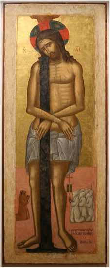 An alternative source could be the iconography not of the Man of Sorrows in the type of Blood of the Redeemer but of Christ tied to the Column, as illustrated in two paintings attributed to either Zanino di Pietro or to an artist called the “Maestro di Santa Barbara a Matera”, whose art was nurtured by Venetian visual aesthetics. The two panels are oblong and are held in the city of Barletta, the first in the cathedral of Santa Maria Maggiore (Figure 9) and the other in the church of Sant’Agostino (D’Elia 1964, p. 54; Boskovits 1984, pp. 235–36, fig. 6; Baradel 2019, p. 41, note 98).17 Although their iconography does not represent a dead Christ, both paintings suggest the Man of Sorrows. They show Christ wearing only his loincloth and the crown of thorns, with his eyes half-shut; he embraces the column of the flagellation with his arms crossed. The way Christ’s hands are crossed across his abdomen alludes to similar gestures in depictions of the Man of Sorrows, like that of the Kykkos Museum and the Kato Archimandrita Man of Sorrows. In the same vein, Cretan painter Angelos Bitzamanos (1467–1535), treading on the heels of Zanino Di Pietro (or the “Maestro di Santa Barbara”), created, in Barletta, a panel presenting the same subject and destined for the church of the Santissima Annunziata in San Mauro Forte in Matera (Figure 10) (202 × 76 cm) (Belli D’Elia 1988, pp. 141–42, no. 47 [entry: Clara Gelao]; Constantoudaki-Kitromilides 2009, pp. 171, 185, note 67; Voulgaropoulou 2021, p. 17). To sum up, despite the fact that the Cypriot panels of the Akra Tapeinosis are more Byzantine in their iconography, some details do stand out as Italian and imply that their painters were privy to and creatively reconceptualised Venetian paintings of the quattrocento, or of Cretan works, that in turn, emulated Venetian ones. The specificities and the agencies of transmission of kindred models to Cyprus is a topic that future scholarship is invited to disentangle.