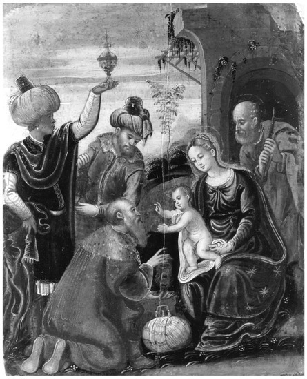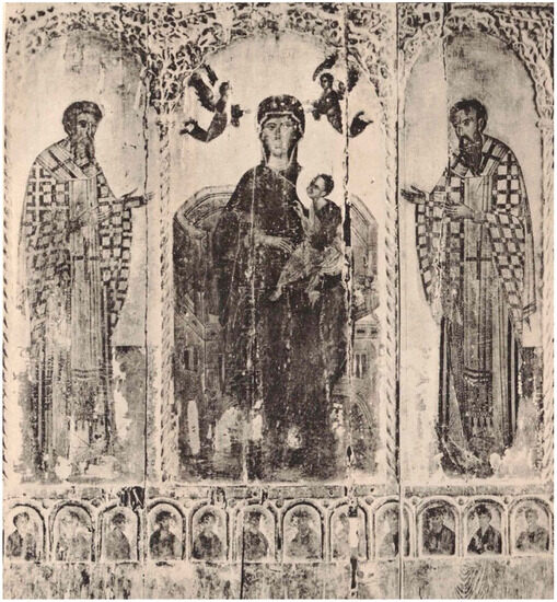 Another fascinating panel, which became the subject of a legend, is a painting from the 1530s and was once kept in the monastery of Saint John Chrysostom at Koutsovendis, Kyrenia (Figure 12) (70 × 92 cm). Unfortunately, the panel has been missing since the Turkish invasion of the island in 1974, despite its detection in 1997, in Germany, in possession of a Turkish dealer of antiquities (Talbot Rice 1937, no. 152, p. 274; Papageorgiou 1970, pp. 104, 115; Papageorghiou 1992, p. 143, fig. 95; Frigerio-Zeniou 2003–2004, p. 274, note 72; 2012, pp. 184–86). The painting shows Cyprus’ native saint, John the Almsgiver, introducing two kneeling worshippers to the enthroned Virgin (portrayed in three quarters), with the Child perched on her right knee. The supplicants/donors address their prayers to the Virgin Mary and grip rosaries in their hands. The Virgin stares out at the viewer while Christ turns his head towards his mother while blessing the donors. The inscription that identifies the devotees is almost abraded. However, one can still read the following: “H ΔEΓIΣIC TIC ΔOΥ/ΛIC (TOΥ ΘEOΥ M)APIAC/TOY (…) O/(…) O(?)/(…) MOΛIN” (supplication of the servant of God Maria […] Molin) (Papageorghiou 1992, pp. 141, 143, fig. 95; Frigerio-Zeniou 2003–2004, p. 274). As we will see presently, the dedicatory inscription and the laypersons’ portraits identify a likely Greek-speaking mother named Maria and her son, dressed in Venetian fashion and possibly of Venetian background.