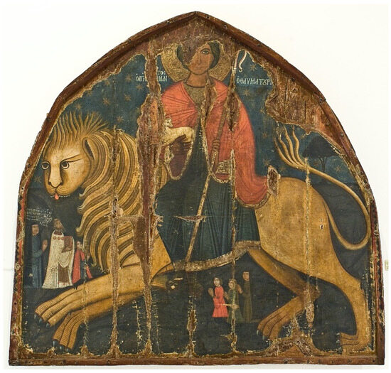 The last part of the essay probes lunette-shaped panels, a topic which, although significant, cries out for further investigation since these works and their usage have only been studied tangentially. The first panel I consider is held in the church of the Panagia Katholiki in Pelendri and belongs to the sixteenth century (Figure 25). It is a Deïsis that comprises the Christ enthroned at the centre, flanked by the Virgin Mary and Saint John the Baptist in supplication (47.7 × 104.5 cm). The icon is attributed to the master who painted the series of icons of the Great Deïsis on the epistyle of the iconostasis in the same church (Papageorghiou 1992, p. 116, fig. 73; Gerasimou 2005, p. 117; Sophocleous 2006, pp. 127, 231, no. 197). A second lunette panel, which dates from around 1511 and lies in the katholikon of the Monastery of Saint Neophytos in Paphos, displays the Dormition of the Virgin (150 × 169 cm) and features a commemorative inscription in the foreground, close to the Virgin’s bier, which reads as follows: “Supplication of the servants of God, Timotheos the priest and abbot of the venerable monastery of Enkleistra and of the late Neophytos the monk” (Gunnis [1936] 1947, p. 201; Talbot Rice 1937, p. 272, no. 149; Papageorghiou 1992, pp. 153, 161, fig. 110; Papageorghiou 2004, p. 62).31 A third icon of that kind, also from Paphos, is a gigantic panel with a rounded top (171 × 163.5 cm) that presents Saint George, called Pervoliatis, with scenes from his life, currently in the Byzantine Museum of Paphos. The work was formerly housed in the church of Saint Kendeas and is datable to the early sixteenth century (Papageorghiou 1992, pp. 142, 146, fig. 98; 1996, p. 177, fig. 113). A fourth lunette with a slightly pointed arched top is a Saint Mamas on the back of a lion with six donors (1500). An inscription on the right side of the panel and above the head of a female supplicant, most probably Antona, reads: “the servant of God Antona, a priest’s wife, fell asleep. Those who read [this inscription] pray for her to be blessed—on the 29th of February 1500 […].” The icon was once kept in the church of the Panagia Chrysaliniotissa in Nicosia (199 × 200 cm) and now hangs in the Byzantine Museum of the city (Figure 26) (Talbot Rice 1937, pp. 237–38, no. 78; Frigerio-Zeniou 2012, pp. 29–32). A fifth panel of similar shape, formerly in Chrysaliniotissa, shows the Virgin and Child, called Kamariotissa, with six supplicants; the painting is equally monumental in size (210 × 120 cm) and dates to the late fifteenth century (Figure 27). Two inscriptions frame the throne of the Virgin. The first one in black, atop a darkly dressed female suppliant, reads: “Prayer of the servant of God Bella, daughter of lord Nicholas, bishop of Nicosia, of blessed memory, and her children. And pray for them to the all-pure Mother of God.” On our right-hand side, the short text in white, above a male donor, runs as follows: “Lord, remember your servants Lord Eustathios and his daughter Helen. May those who read this commemorate them as blessed.” (Talbot Rice 1937, pp. 230–31, no. 64; Koumparidou 2001, pp. 527–34; Carr 2005b, pp. 159–63; McNulty 2018, pp. 283–87). Last, a sixth lunette icon from Chrysaliniotissa again includes the Three Hierarchs receiving Christ’s blessing. It is a gigantic oblong panel with a pointed arch at the top (238.5 × 141.5 cm) and dates from the late fourteenth/early fifteenth century (Papageorghiou 1992, pp. 67, 71, fig. 48; Eliades 2019, p. 131, no. 39).