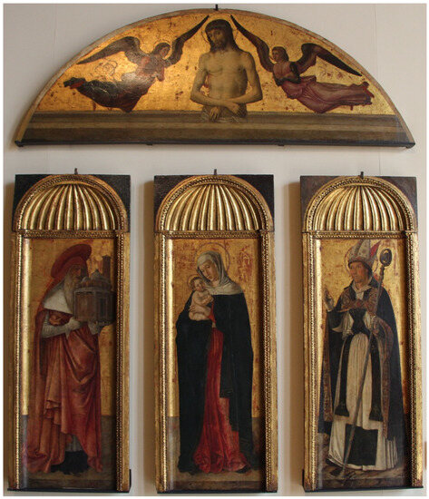 Lunette panels find their correspondences in Italy, especially in Venice. Except for the Three Hierarchs lunette, all the surviving examples in Cyprus belong to the Venetian period of the island, and they probably became known and popularised by means of Venice. Italian lunette panels generally date from the late thirteenth to the late fifteenth centuries and find their roots in Venice and also in Liguria, Tuscany, Naples, and Sicily; they were either set into tympana atop doors or into sepulchral monuments in the area beneath the baldachin or canopy (Schmidt 2002, pp. 83, 87). A renowned example with a funerary use is the panel (145 × 233 cm) by Paolo Veneziano (c. 1300–c. 1365) for the Franciscan Basilica of Santa Maria Gloriosa dei Frari in Venice (Figure 28) (Goffen 1989, p. 102, fig. 72). Veneziano’s lunette depicts Doge Francesco Dandolo († 1339) and his wife, Elisabetta Contarini, being presented to the Virgin and Child by Saint Francis and Elizabeth of Hungary. A drawing of 1754 by Jan van Grevenbroeck (1731–1807) verifies that the panel comprised part of the tomb of the Doge, once laid in the chapterhouse of the Frari (Pincus 2000, pp. 105–20; Schmidt 2002, p. 83, figs. 1–2). The practice of inserting a lunette panel painting in an architectural setting such as an arcaded niche seems to have endured throughout the fifteenth century. Much like Veneziano’s painting, Lazzaro Bastiani’s (1429–1512) lunette panel (100 × 180 cm; completed 1484) with the Virgin and Child, Saints John the Baptist, and Donato introducing the donor, the canon Giovanni degli Angeli († 1481), graced the latter’s tomb in the church of Santi Maria e Donato in Murano and was undoubtedly influenced by Veneziano’s lunette (Figure 29) (Goffen 1989, p. 102, fig. 71; Sartor 1997, pp. 45–46, fig. 7). Sepulchral and architectural functions aside, Italian lunette-shaped panels, with a rounded arch at their top, constituted the apex of many Renaissance altarpieces (Schmidt 2002, p. 87). For instance, fifteenth-century Venetian lunettes that fulfilled this purpose were part of four triptychs destined for the church of Santa Maria della Carità and were produced by the workshop of Jacopo Bellini between 1460 and 1464 (Figure 30) (Humfrey 1990, pp. 190–211; Humfrey 1993b, p. 96, pls. 86–89).