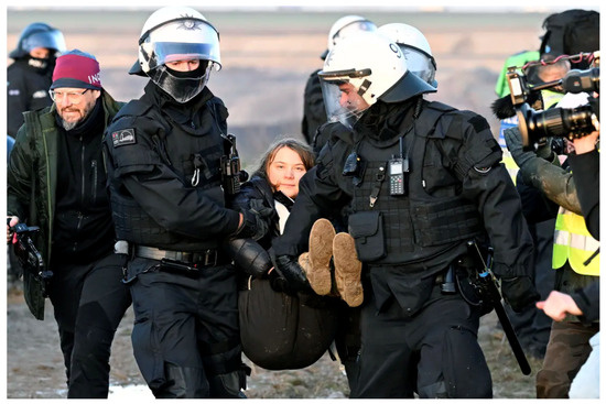 Figure 12. Police officers carry Swedish climate activist Greta Thunberg away from a mine during a protest by climate activists in Lützerath, Germany. Image by Federico Gambarini via AP.