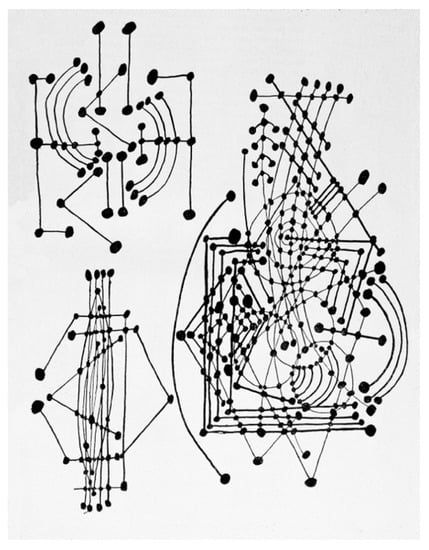 The visual language of Picasso’s star charts does not fit neatly into the usual semiological classifications. The musical instruments in Three Guitars are drawn with rounded bodies and long, straight (or gently curved) necks. One can hardly say that these contours are “arbitrary signs”. They are more like what Charles Sanders Peirce calls “icons”—that is, signs based on resemblance.20 What makes this representation harder to see is the repetition of the schematic contours, nested within one another, and the addition of the dots. Together, these transformations draw the viewer’s attention away from the basic schema of each instrument, making it seem like a random patch of dots and lines. The original, legible schema is “motivated”, as Saussure would say, by its resemblance to an actual musical instrument. As Picasso multiplies its elements, the design comes to seem increasingly arbitrary. But this is not the foundational arbitrariness of the spoken or written signifier: it is a simulated arbitrariness, a post facto withdrawal of meaning.