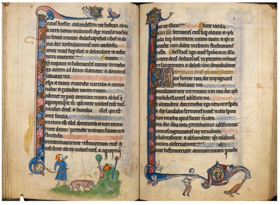 Anonymous scribe and artist. Rutland Psalter. C. 1260. London, British Library, Add MS 62925, folio 57v and 58r.