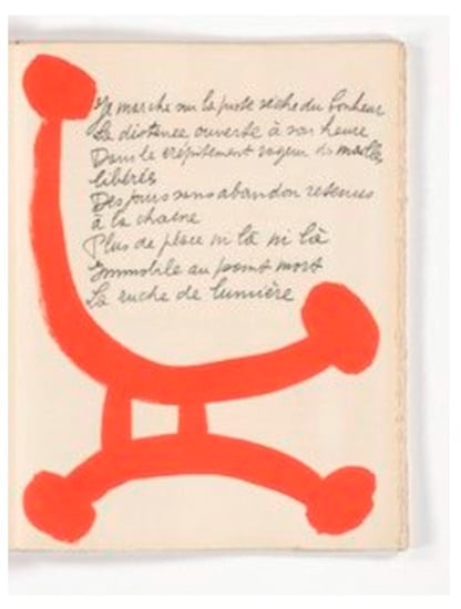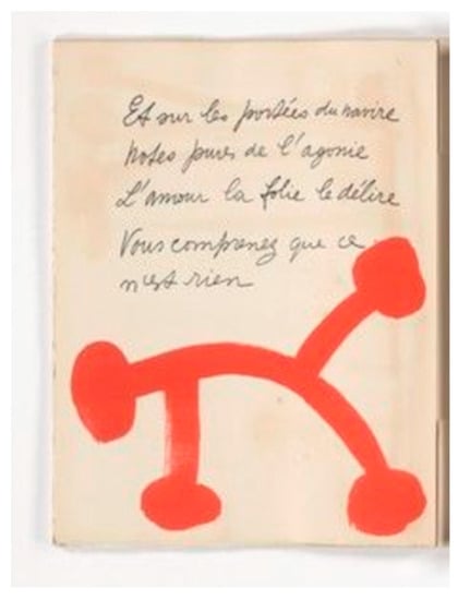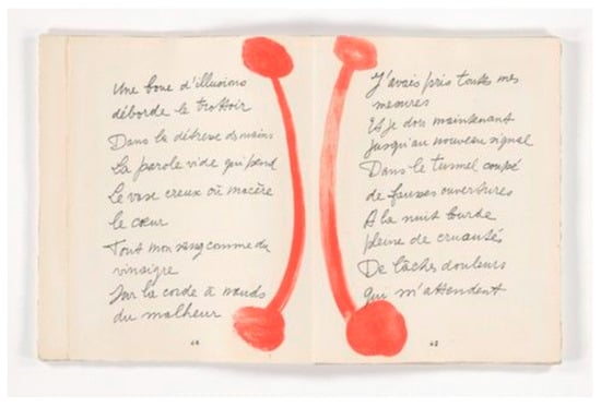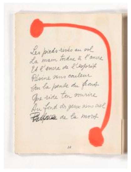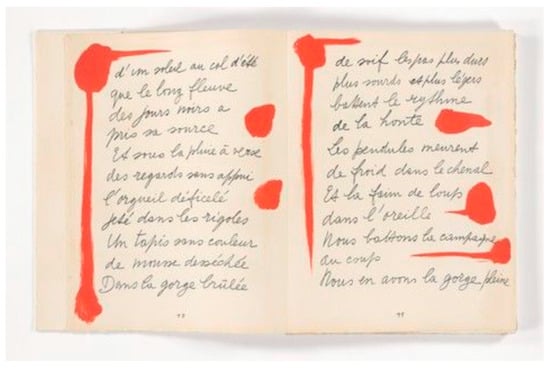 Similarly, in a typical page spread from the first, long poem in Le Chant des morts (“Il a la tête pleine d’or”), both text blocks are bordered at left by vertical red streaks, with a shorter red streak extending part way across the top of the text (Figure 4). The two streaks are joined by a red blob, recalling the barbell of the 1948 Arabesque. Where a short line of text leaves a space at right, Picasso fills it with a red blob and/or horizontal streak.