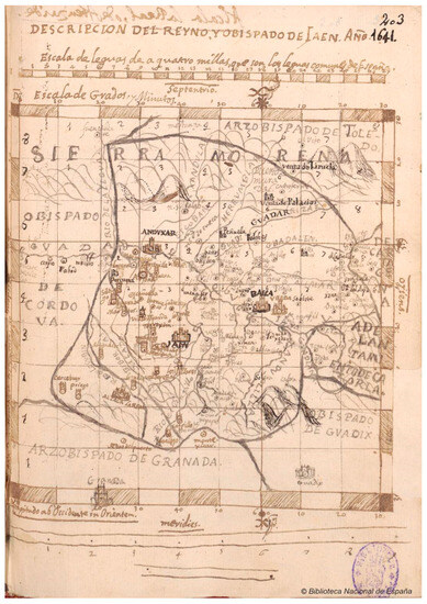 In folio 203, a description of the kingdom and bishopric of Jaén in the year 1641 was included (Figure 1). This may have provided a basis for the map of this territory made by the engraver Gregorio Fosman y Medina (Gregorio Forst) in 1653 (Figure 2).