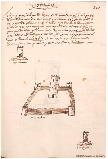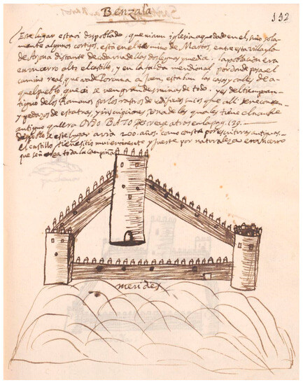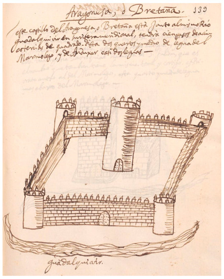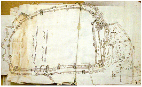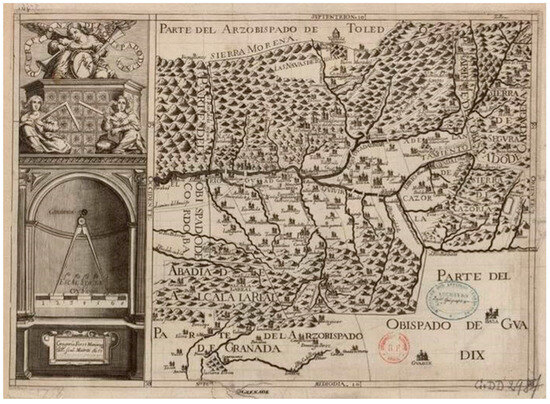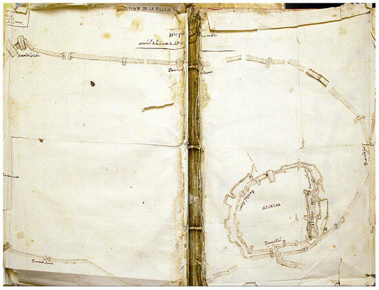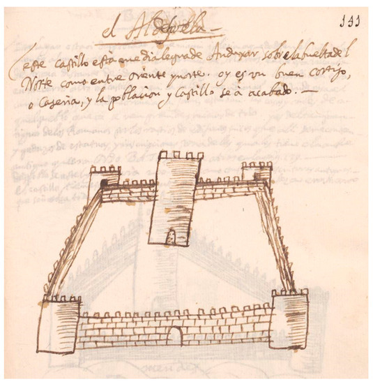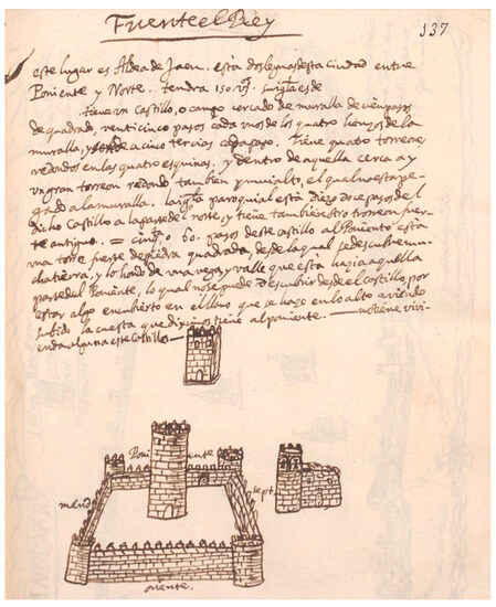Thus, Ximena Jurado stood out for being a pioneer of the historical cartography of this Hispanic region. This can be seen in his maps of the kingdom and bishopric of Jaén (Figure 1) from 1641 to 1654, where he tried to represent both the settlements that were inhabited in his time and the depopulated and emblematic ancient places, their ruins, and fortifications. The data and drawings of castles, towers, and walled enclosures that he included in his texts show a special interest in the militarisation of cities and their territory. He mapped ruins and drew fortifications in his manuscript, accompanying them with various texts. He undertook exceptional work given the enormous wealth of the remains of cities and fortified sites in the Kingdom of Jaén (Mozas Moreno 2018, pp. 482–84).