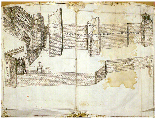 Another drawing of the ‘altar and idol chapel’ labelled ‘The Town of Martos: Colonia Augusta Gemella Tuccitana’ was introduced in his book Anales de la ciudad de Arjona (Ximena Jurado 1643, p. 162). In this work, they are represented in a pseudo-perspective formed by elevations in a succession of planes containing the towers, walls, and individualised dwellings with gabled roofs of the village of Martos in its lower part as well as the high fortress in the upper part.