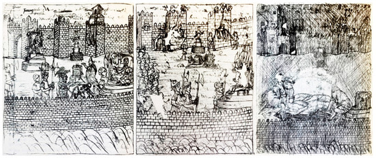 - Some of the details are quite precise, but others are less accurate and furthermore inconsistent with reality, with different layouts of the depicted elements (Figure 4 and Figure 25). Not all of the drawings that were in his own handwriting were made at the site or in front of the original—in certain cases, he would have drawn them from the descriptions or sketches from third parties.