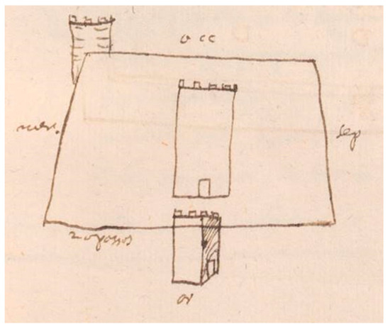 In the upper right-hand corner, the motte fortress is drawn with its main tower and two stretches of wall that connect to the perimeter ramparts.