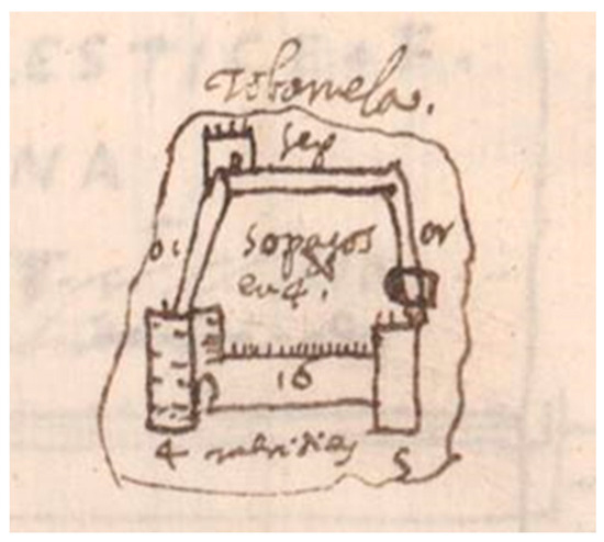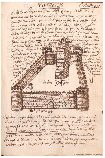 At the end of the chapter that Ximena Jurado dedicated in Ms. 1180 B.N. to the antiquities ‘in the town of Linares’ (fol. 96v) and ‘in Cazlona [Cástulo]’ (fol. 97), in fol. 109v, he introduced two fragments of inscriptions that would be ‘in the door of the ante-wall of the castle of Linares’ and ‘in the tower of the door of the castle of Linares’. He accompanied them with a pseudo-perspective sketch of the castle, although he did not label the name, as he did in fol. 110 (Eslava Galán 1999, pp. 362–65).