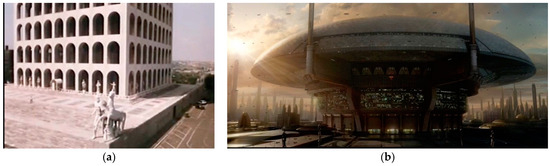 (a) The Belly of an Architect by P. Greenaway (1987). The EUR district in Rome, Italy. Palazzo della Civita’ Italiana by Guerrini, La Padula, Romano (Rome, EUR, 1938); (b) Star Wars III—Revenge of the Sith by George Lucas (2005).