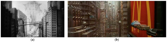 The question of urban quality is no longer solely related to the complexity of functions and building plans but also intimately tied with the identity and meaning of the image portrayed (as shown in films such as F. Lang’s Metropolis in 1927 and D. Cannon’s Judge Dredd in 1995 Figure 7a,b). The changing actors in the urbanisation process, along with the shift in spatial and temporal measures, have resulted in a transformation of the city’s structure, including its relationships with citizens and time.