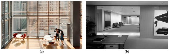 Ultimately, the Metropolitan Architecture Project must also focus on creating an interior landscape, which intensifies the time of metropolitan citizens (Le Vertige by R. Mallet-Stevens (1926); Total Recall by Paul Verhoeven (1990)) (Figure 12a,b). Architects should take inspiration from R. Piano’s New York Times Building (2007) (Figure 13a) and Mies van der Rohe’s and Philip Johnson’s Seagram Building (1958) (Figure 13b) to create new typologies of interior landscapes rather than just focusing on the building’s specific function.