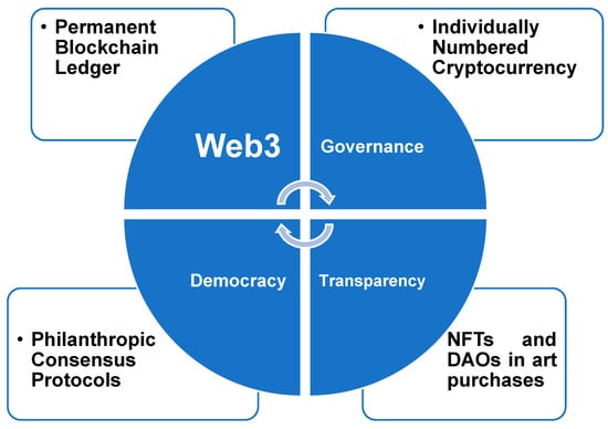 Crane () makes the critical observation that Web3 is disrupting the art world, breaking the status quo. Power has shifted away from art galleries and museums to decentralised networks and artist-to-fan-based communities. Art houses were at the seat of power, having a bureaucratic gatekeeping role, being entrusted to validate the provenance of contemporary or legacy art (; ). Unestablished artists need to attend art fairs, degree shows and incubator galleries to present their wares. New artists hope to receive favourable recognition from long-established internationally respected institutions, attending these low-level art exhibitions (). Artists are now able to display their art on social media platforms and increase their exposure, as new people say they “like” what they have seen on social media. The new artist receives exposure from another source of people, who are on the friends list of a person who initially “liked” the art they directly saw. With this approach, an emerging artist is able to build up a public profile of their art, occasionally receiving an income, based on the number of visits to their social media website (). The dawn of Web3 in the 2020s has added to the social media era of the early 21st century. “In Web3, artist and collectors connect directly with each other, participating in the same communities and transacting without an intermediary. Artworks (in their digital form) can be displayed and distributed at the touch of a button, both in interactive virtual spaces and in the physical realm via projections and screens” (). The decentralisation utility of Web3 has broken down traditional barriers of art institutions, enabling constituent parts of the art world to interact. In this sense, the governance role of Web3 is delivered on a decentralised surveillance basis. Here, decentralised surveillance can be defined as Web3’s ability to track the movement of every artist who has chosen to engage with a privately owned section of Web3. This helps in establishing art-item provenance, alongside issues of copyright, intellectual property rights and plagiarism. For example, the ARTRACX curator platform applies a blockchain solution to provide unique digital identities for art stakeholders’ artwork and collectibles (). Governance is enhanced by the fact that the blockchain technology used is supplied by an independent third party, not controlled by the ARTRACX platform. DAO governance’s decentralised surveillance is able to identify who first came up with an original art image and/or a novel approach to art creation, where and when. Decentralised surveillance can also be manifest as the roles of artists, collectors, curators and producers becoming merged, delivering day-to-day surveillance as work is delivered. Every art stakeholder can see what every other constituent part is doing (). These art-world stakeholder constituencies are onboarding onto art project partnerships, which facilitates decentralised art surveillance by using DAOs for governance and transparency. The art world is transitioning rapidly. In this context, Web3 is not so much about authentication and verification, but more about validation of approach, changing the status quo to reflect the diffuse nature of the art world in the 2020s. In this sense, Web3 does not seek to destroy the traditional international art market and the established systems which have developed to facilitate the process (). Web3, including DAOs and NFTs, will work in harmony with traditional systems, by providing outlets for the sale and purchase of international art pieces (see Figure 1).