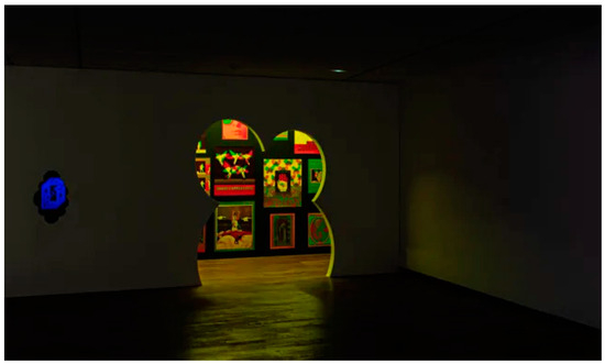 As visitors moved through the exhibition, they happened upon a small, glowing room with a cartoonish opening. Designed to house the kinetic lithographs in the exhibition, Carballal created a semienclosed space to better experience them. Tube lights hung around the ceiling’s perimeter and radiated varying hues, including red and green (see