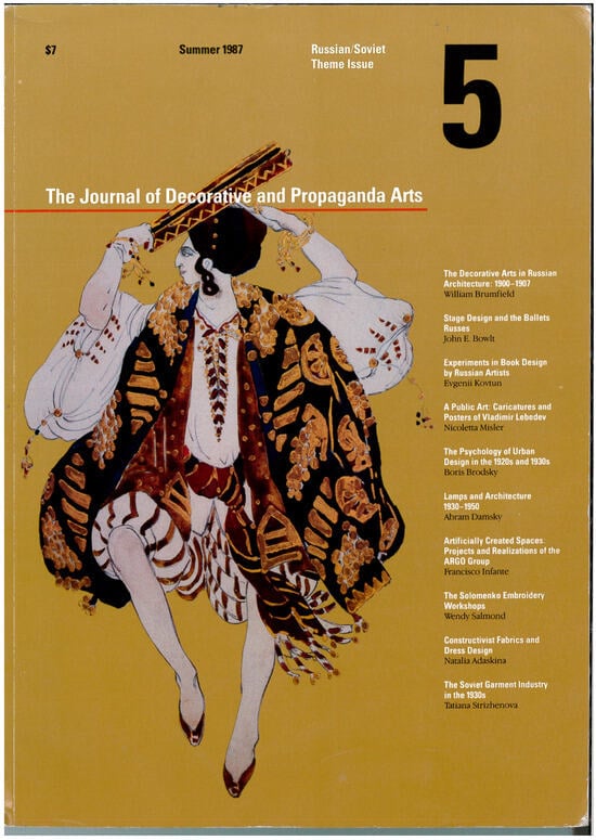 “The Journal of Decorative and Propaganda Arts”, Russian/Soviet Theme Issue (5), edited by John E. Bowlt, summer 1987. Cover: Lev Bakst, costume for Cléopatre, male dancer holding a tambourine in the “Dance Juive”, gouache heightened with gold paint, 1909. Collection of Mr. and Mrs. D. Lobanov-Rostovsky, London (Bowlt 1987).