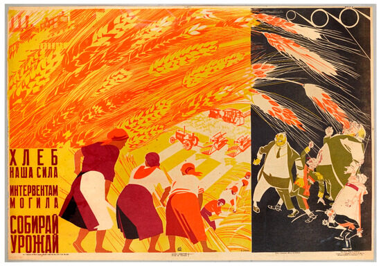 Dmitri Stakhievich Moor, Khleb nasha sila, interventam mogila: Sobirai urazhai (Bread is Our Strength, (and) the Interventionist’s Grave: Gather the Harvest), 1931, print on paper, Wolfsonian—FIU, TD1994.29.1.