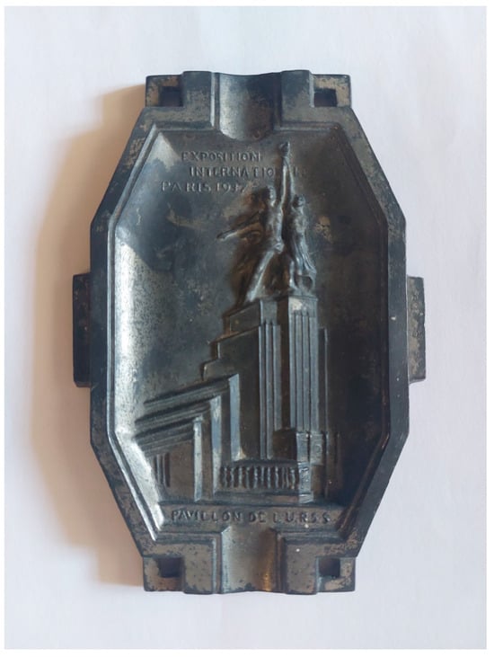 What distinguishes the two collections is mainly the fact that the Miami museum presents a broader international scope in its collections, while the one in Genoa appears mainly focused on the Italian context5, although it also documents significant foreign fields of research. With respect to Soviet political identity in the historical period under consideration, few works and documents are preserved at the Wolfsoniana which, nevertheless, reveal the peculiarities of the collector’s cultural and aesthetic interests. We find, for example, a metal plaque depicting Boris Iofan’s Pavillon de l’Urss, surmounted by Vera Mukhina’s statue of The Worker and the Kolkhoznitsa, for the 1937 Exposition Internationale “Arts et Techniques dans la Vie moderne” in Paris (87.623.19.1; Figure 8).