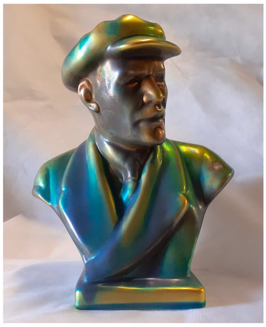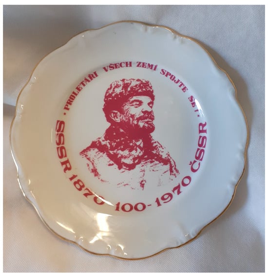 Three other different models of memorabilia are represented by the iridescent glazed bust of Lenin, produced with the usual luminescence of enamels by the Hungarian Szolnay manufactory in Pecs in the early 1960s (The Michell Wolfson Jr. Private Collection, Genoa-Miami, on loan at Wolfsoniana—Palazzo Ducale Fondazione per la Cultura, Genoa; Figure 9); the acrylic fiber flag dated around the 1980’s with the inscription “To the struggle for the mission of the Communist Party of the Soviet Union. Be ready” (GX1993.327); and a plate with the effigy of the Russian leader and the inscription «Proletarians of the world unite», issued by the Czechoslovakian manufacturer Bohemia in 1970 on the centenary of Lenin’s birth (The Michell Wolfson Jr. Private Collection, Genoa-Miami, on loan at Wolfsoniana—Palazzo Ducale Fondazione per la Cultura, Genoa; Figure 10).