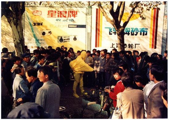 The 1980s saw the first examples of performance art in contemporary China. Two notable commonalities among many of the performances of this period were that they were performed in groups, and they involved the participants wrapping their bodies in cloth so that they could not be recognized as individuals. Gao Minglu notes the importance of the fact that these were performed in groups: “…the experience and process of an individual body language was demolished at the expense of the integration of the public space, the audience, and the artists. That is to say, when the artist engaged in performance art, he often turned his individual identity into a collective identity” (Gao 2007). The obscuring of the artists’ individual traits with cloth also has this effect. One early example of performance art involving wrapping is a series titled Cloth Sculpture, performed in 1986 by Zhang Guoliang, Ding Yi, Qin Yifeng, and students from the Academy of Fine Art at Shanghai University. At various public locations throughout Shanghai, the artists statically posed, wrapped in a yellow cloth. When they posed together, the yellow cloth bound their bodies into one unit. “In doing so”, argues Gao, “the artists attempted to free art from studios and museums and insert it into the public space, bringing the audience into their art-making process”. (Ibid., p. 168). In one photograph of the performance, for instance, two figures sit at a table in a coffee shop. Their bodies and heads are completely covered in cloth and they face each other, enacting a tableau of two people eating together. Their placement in public is apparent by the crowd of people lined up behind them. In another, a wrapped figure stands in a bustling crowd on a street in Shanghai. He statically poses with his right arm extending forward and left resting on his hip. While some passersby ignore him, a few line up to face him, as if waiting for something to happen.9 In the photograph of the event, the wrapped figure stands in the center of the composition, the only moment of stillness within a swirl of activity (Figure 3). In both instances, there is a dissonance between the figures and their environment due to their indeterminate status.