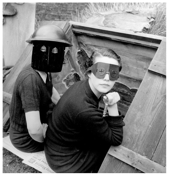 Another image within this rhetorical detour is one taken in 1941 in London by Lee Miller (Figure 2), whose photographic practice began in 1929, when she was the companion of Man Ray, and took up professionally a position as a photojournalist and correspondent, accredited with the U.S. Army from 1942. It depicts two women looking toward the photographer and consequently the viewer, but their faces and gaze are screened by their grotesque (or avant-garde) masks designed to protect them from the blinding effects of firebombs, but also—one could speculate—the objectifying operations of the camera. So, what we are looking at is a kind of visual conversation between the women photographed and the female photographer. Miller’s camera is not capturing its objects, not hunting for prey, but rather depicts a transactional exchange between the photographer and her two subjects: I see you—you see me—I see you seeing me. These women are vulnerable to the bombs rained on London but not, arguably, to the violent ways of seeing and looking endemic to the camera (Penrose 1992; Bourke-White [1963] 2016; Ofer and Weitzman 1998). I am thus reading this photograph as an introduction to the female photographic gaze in relation to war and violence, and to a conceptualization of the witnessing camera of a woman war photographer. As Jean Gallagher, from whom I am borrowing this example, observed: “these two figures ask us to consider how women were looked at during World War II and how they in turn looked through a set of technological contrivances, the literal and figurative, physical, and rhetorical technologies of vision that constrained and constituted how they saw and were seen” (Gallagher 1998, p. 2).